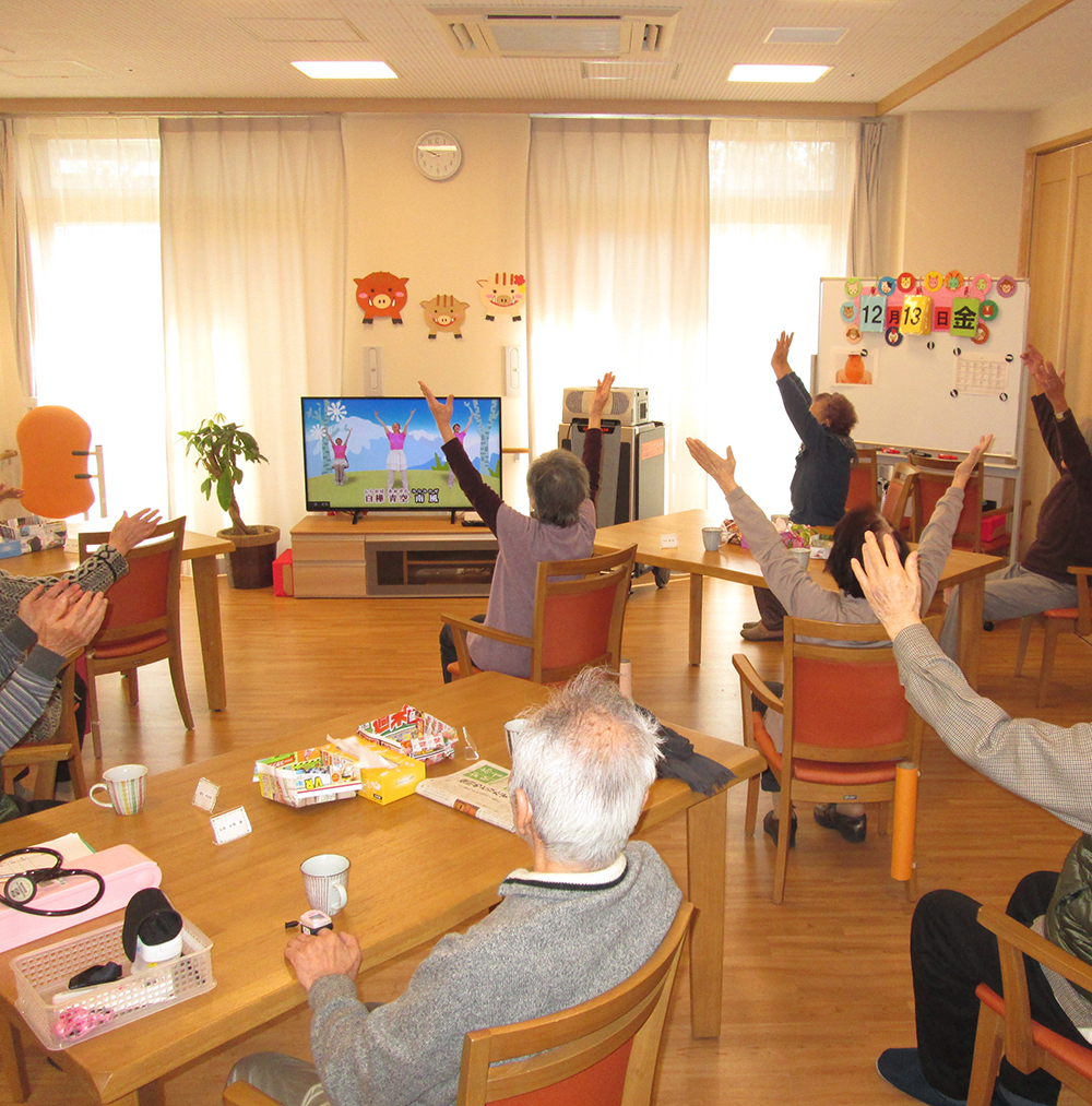 リハビリデイサービスさみたは、機能訓練士がひとりひとりにあった訓練を提供しています。日常生活に必要な筋力強化の為、マシンを使ったトレーニングの他、棒やボールなどを使っての集団体操、ラジオ体操や歌謡曲体操などの運動メニューを実施し、ご利用者様に長く在宅生活を続けていただけるよう取り組んでおります。